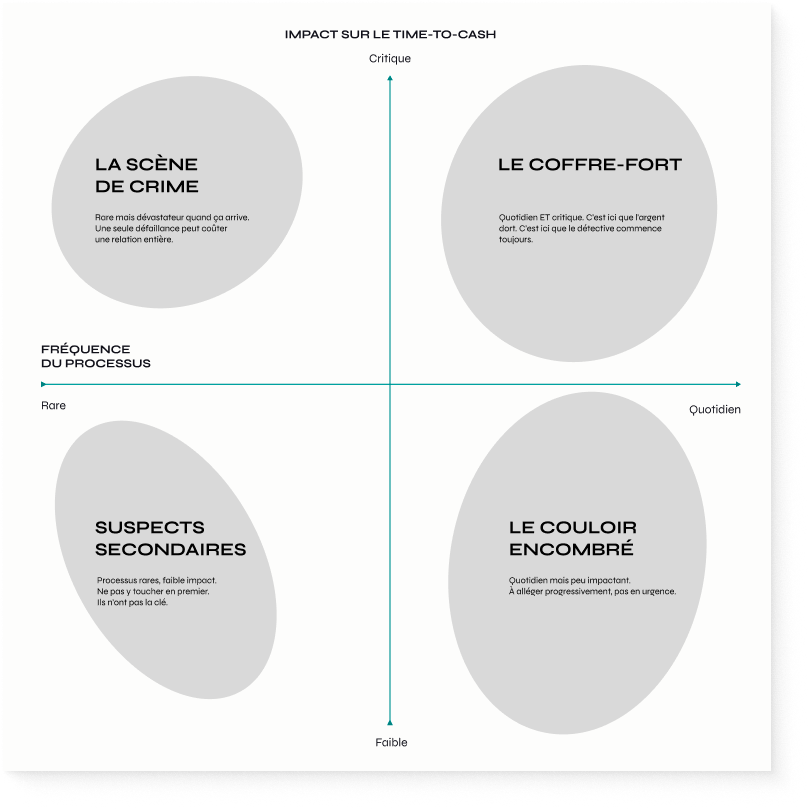 Cette grille croise deux axes : la Fréquence du processus (de Rare à Quotidien) et son Impact sur votre Time-to-Cash [^Time-to-Cash : Délai entre la signature d'un contrat et l'encaissement effectif du paiement. Indicateur clé de fluidité opérationnelle, rarement mesuré dans les PME de moins de 300 collaborateurs.] (de Faible à Critique).