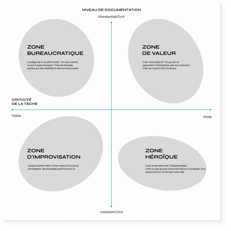 C'est le domaine des "indispensables" (Haute Criticité + Basse Documentation). C'est ici que se joue votre valorisation à la baisse. Si la personne part, l'actif part avec elle.